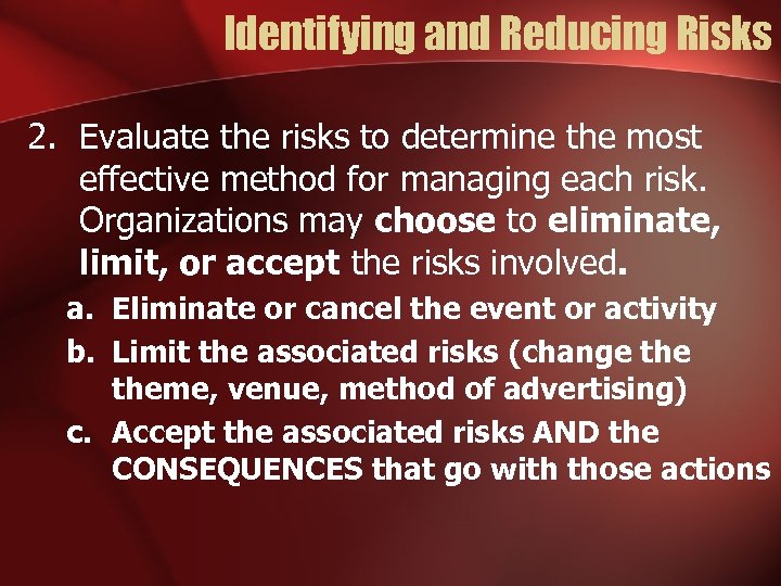 Identifying and Reducing Risks 2. Evaluate the risks to determine the most effective method for managing each risk. Organizations may choose to eliminate, limit, or accept the risks involved. a. Eliminate or cancel the event or activity b. Limit the associated risks (change theme, venue, method of advertising) c. Accept the associated risks AND the CONSEQUENCES that go with those actions