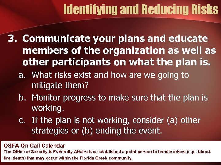 Identifying and Reducing Risks 3. Communicate your plans and educate members of the organization as well as other participants on what the plan is. a. What risks exist and how are we going to mitigate them? b. Monitor progress to make sure that the plan is working. c. If the plan is not working, consider (a) other strategies or (b) ending the event. OSFA On Call Calendar The Office of Sorority & Fraternity Affairs has established a point person to handle crises (e. g. , blood, fire, death) that may occur within the Florida Greek community.