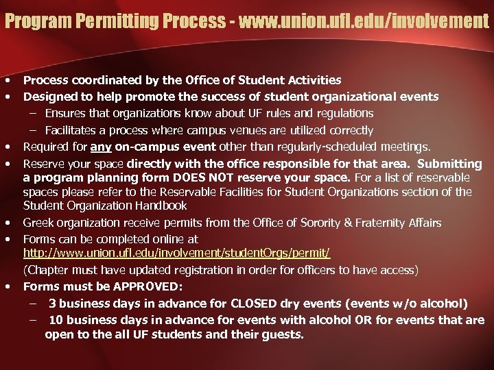 Program Permitting Process - www. union. ufl. edu/involvement • • Process coordinated by the Office of Student Activities Designed to help promote the success of student organizational events – Ensures that organizations know about UF rules and regulations – Facilitates a process where campus venues are utilized correctly Required for any on-campus event other than regularly-scheduled meetings. Reserve your space directly with the office responsible for that area. Submitting a program planning form DOES NOT reserve your space. For a list of reservable spaces please refer to the Reservable Facilities for Student Organizations section of the Student Organization Handbook Greek organization receive permits from the Office of Sorority & Fraternity Affairs Forms can be completed online at http: //www. union. ufl. edu/involvement/student. Orgs/permit/ (Chapter must have updated registration in order for officers to have access) Forms must be APPROVED: – 3 business days in advance for CLOSED dry events (events w/o alcohol) – 10 business days in advance for events with alcohol OR for events that are open to the all UF students and their guests.