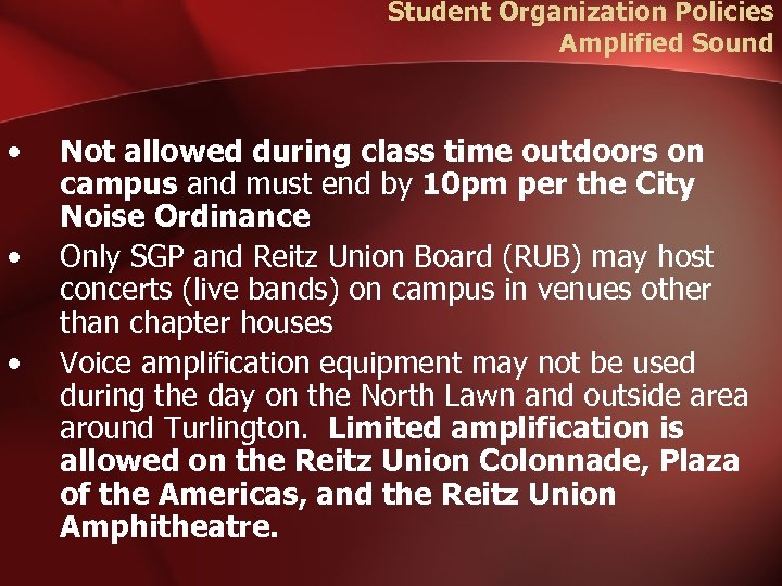 Student Organization Policies Amplified Sound • • • Not allowed during class time outdoors on campus and must end by 10 pm per the City Noise Ordinance Only SGP and Reitz Union Board (RUB) may host concerts (live bands) on campus in venues other than chapter houses Voice amplification equipment may not be used during the day on the North Lawn and outside area around Turlington. Limited amplification is allowed on the Reitz Union Colonnade, Plaza of the Americas, and the Reitz Union Amphitheatre.