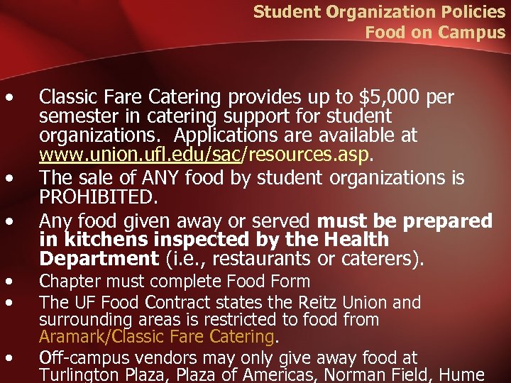 Student Organization Policies Food on Campus • • • Classic Fare Catering provides up to $5, 000 per semester in catering support for student organizations. Applications are available at www. union. ufl. edu/sac/resources. asp. The sale of ANY food by student organizations is PROHIBITED. Any food given away or served must be prepared in kitchens inspected by the Health Department (i. e. , restaurants or caterers). Chapter must complete Food Form The UF Food Contract states the Reitz Union and surrounding areas is restricted to food from Aramark/Classic Fare Catering. Off-campus vendors may only give away food at Turlington Plaza, Plaza of Americas, Norman Field, Hume