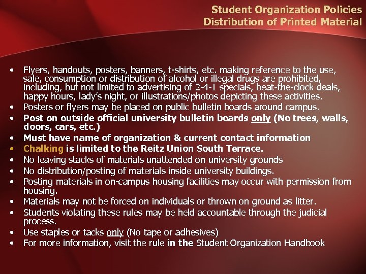 Student Organization Policies Distribution of Printed Material • • • Flyers, handouts, posters, banners, t-shirts, etc. making reference to the use, sale, consumption or distribution of alcohol or illegal drugs are prohibited, including, but not limited to advertising of 2 -4 -1 specials, beat-the-clock deals, happy hours, lady’s night, or illustrations/photos depicting these activities. Posters or flyers may be placed on public bulletin boards around campus. Post on outside official university bulletin boards only (No trees, walls, doors, cars, etc. ) Must have name of organization & current contact information Chalking is limited to the Reitz Union South Terrace. No leaving stacks of materials unattended on university grounds No distribution/posting of materials inside university buildings. Posting materials in on-campus housing facilities may occur with permission from housing. Materials may not be forced on individuals or thrown on ground as litter. Students violating these rules may be held accountable through the judicial process. Use staples or tacks only (No tape or adhesives) For more information, visit the rule in the Student Organization Handbook