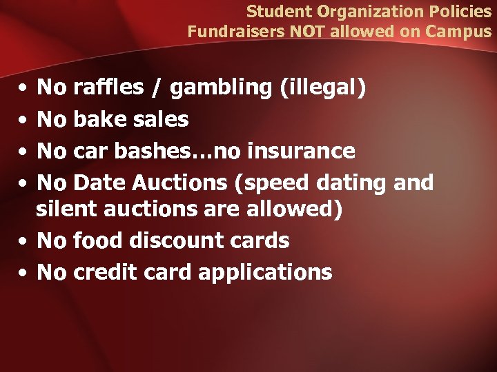 Student Organization Policies Fundraisers NOT allowed on Campus • • No raffles / gambling (illegal) No bake sales No car bashes…no insurance No Date Auctions (speed dating and silent auctions are allowed) • No food discount cards • No credit card applications