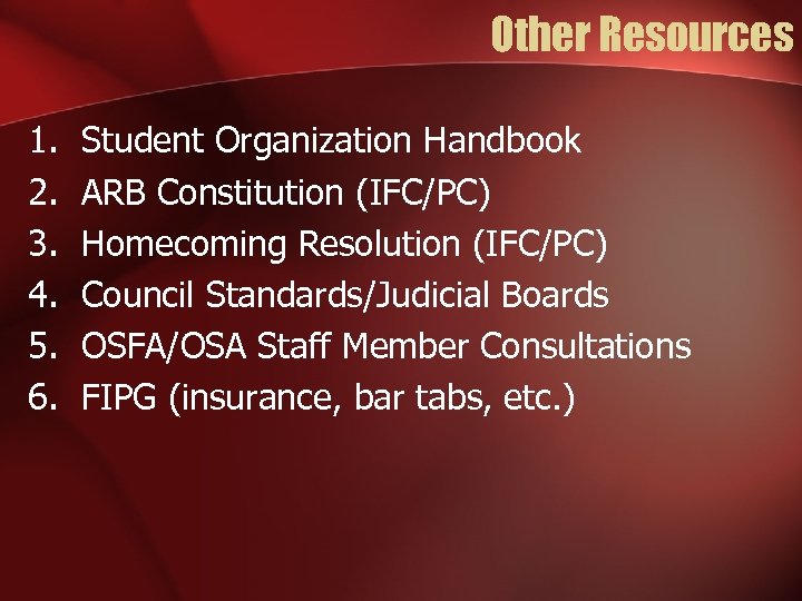 Other Resources 1. 2. 3. 4. 5. 6. Student Organization Handbook ARB Constitution (IFC/PC) Homecoming Resolution (IFC/PC) Council Standards/Judicial Boards OSFA/OSA Staff Member Consultations FIPG (insurance, bar tabs, etc. )