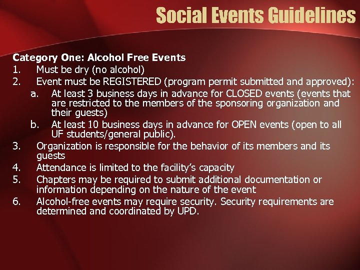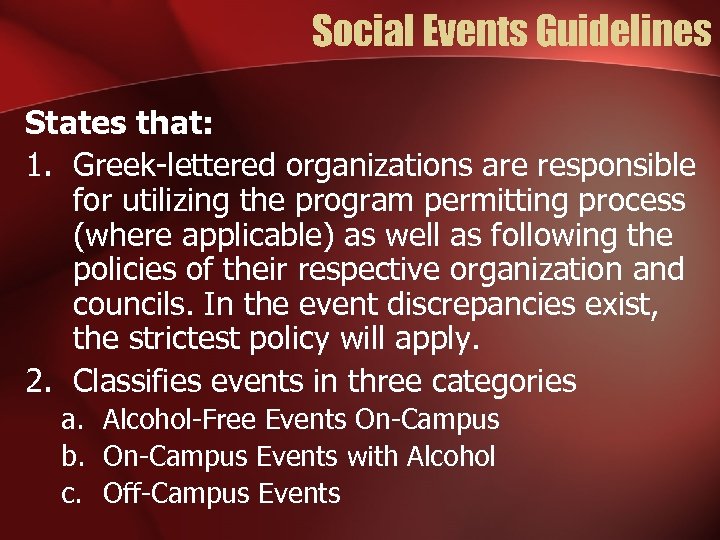 Social Events Guidelines States that: 1. Greek-lettered organizations are responsible for utilizing the program permitting process (where applicable) as well as following the policies of their respective organization and councils. In the event discrepancies exist, the strictest policy will apply. 2. Classifies events in three categories a. Alcohol-Free Events On-Campus b. On-Campus Events with Alcohol c. Off-Campus Events