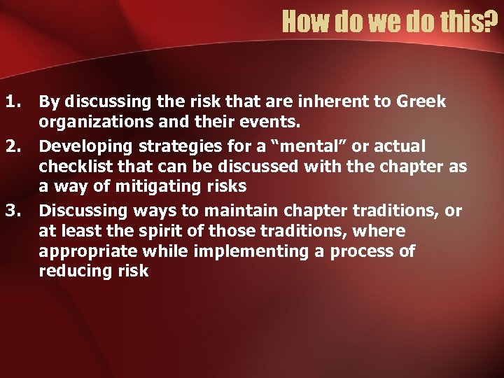 How do we do this? 1. 2. 3. By discussing the risk that are inherent to Greek organizations and their events. Developing strategies for a “mental” or actual checklist that can be discussed with the chapter as a way of mitigating risks Discussing ways to maintain chapter traditions, or at least the spirit of those traditions, where appropriate while implementing a process of reducing risk