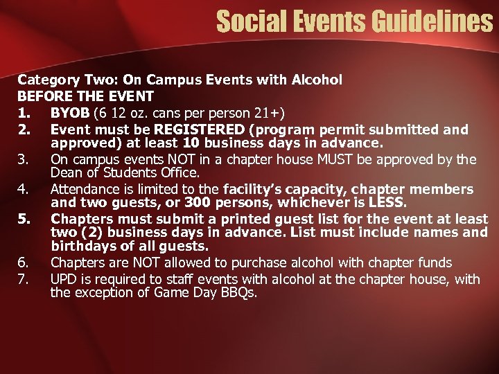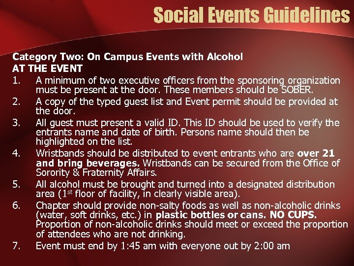 Social Events Guidelines Category Two: On Campus Events with Alcohol AT THE EVENT 1. A minimum of two executive officers from the sponsoring organization must be present at the door. These members should be SOBER. 2. A copy of the typed guest list and Event permit should be provided at the door. 3. All guest must present a valid ID. This ID should be used to verify the entrants name and date of birth. Persons name should then be highlighted on the list. 4. Wristbands should be distributed to event entrants who are over 21 and bring beverages. Wristbands can be secured from the Office of Sorority & Fraternity Affairs. 5. All alcohol must be brought and turned into a designated distribution area (1 st floor of facility, in clearly visible area). 6. Chapter should provide non-salty foods as well as non-alcoholic drinks (water, soft drinks, etc. ) in plastic bottles or cans. NO CUPS. Proportion of non-alcoholic drinks should meet or exceed the proportion of attendees who are not drinking. 7. Event must end by 1: 45 am with everyone out by 2: 00 am