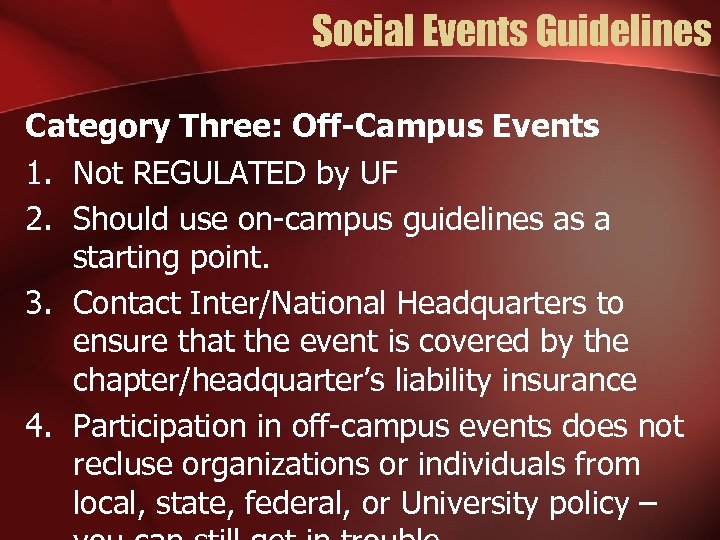 Social Events Guidelines Category Three: Off-Campus Events 1. Not REGULATED by UF 2. Should use on-campus guidelines as a starting point. 3. Contact Inter/National Headquarters to ensure that the event is covered by the chapter/headquarter’s liability insurance 4. Participation in off-campus events does not recluse organizations or individuals from local, state, federal, or University policy –