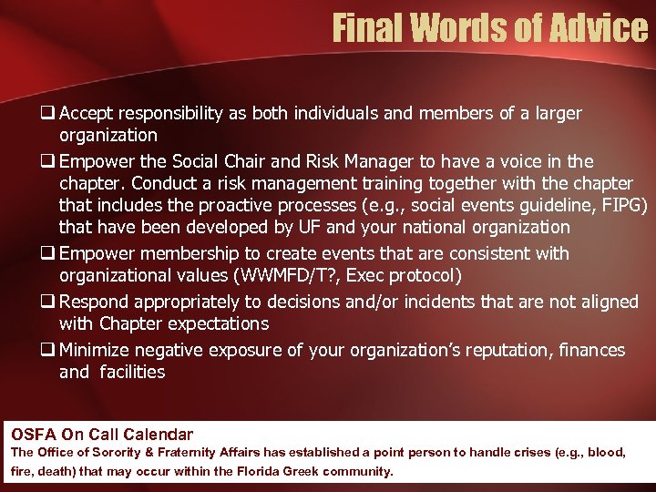 Final Words of Advice q Accept responsibility as both individuals and members of a larger organization q Empower the Social Chair and Risk Manager to have a voice in the chapter. Conduct a risk management training together with the chapter that includes the proactive processes (e. g. , social events guideline, FIPG) that have been developed by UF and your national organization q Empower membership to create events that are consistent with organizational values (WWMFD/T? , Exec protocol) q Respond appropriately to decisions and/or incidents that are not aligned with Chapter expectations q Minimize negative exposure of your organization’s reputation, finances and facilities OSFA On Call Calendar The Office of Sorority & Fraternity Affairs has established a point person to handle crises (e. g. , blood, fire, death) that may occur within the Florida Greek community.
