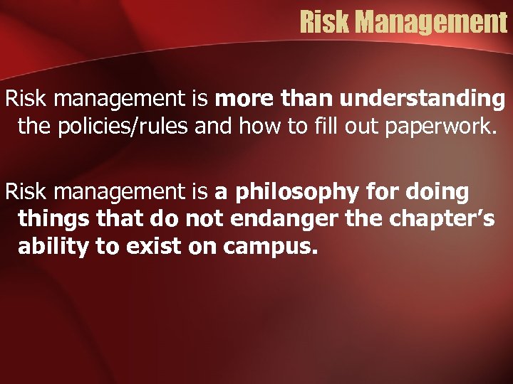 Risk Management Risk management is more than understanding the policies/rules and how to fill out paperwork. Risk management is a philosophy for doing things that do not endanger the chapter’s ability to exist on campus.