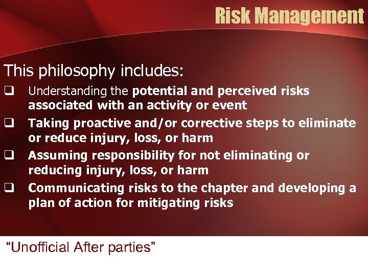 Risk Management This philosophy includes: q q Understanding the potential and perceived risks associated with an activity or event Taking proactive and/or corrective steps to eliminate or reduce injury, loss, or harm Assuming responsibility for not eliminating or reducing injury, loss, or harm Communicating risks to the chapter and developing a plan of action for mitigating risks “Unofficial After parties”