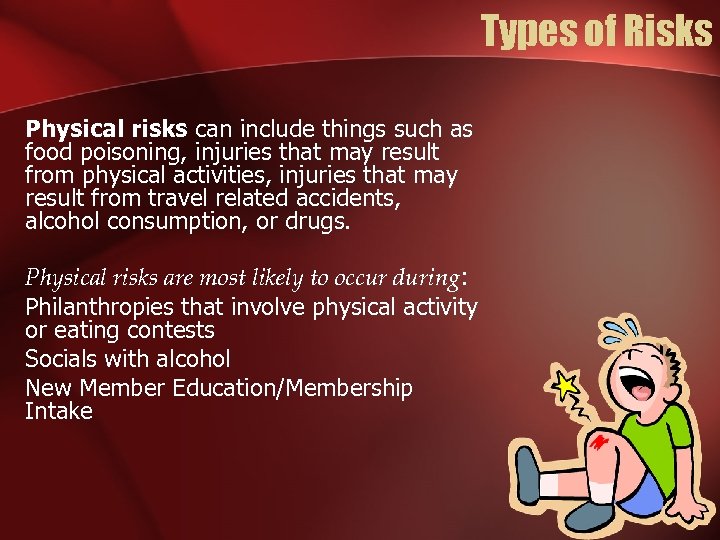 Types of Risks Physical risks can include things such as food poisoning, injuries that may result from physical activities, injuries that may result from travel related accidents, alcohol consumption, or drugs. Physical risks are most likely to occur during: Philanthropies that involve physical activity or eating contests Socials with alcohol New Member Education/Membership Intake