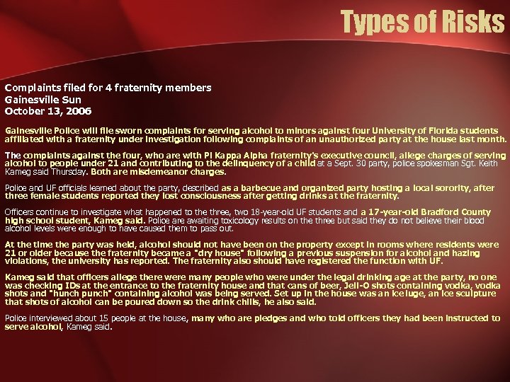 Types of Risks Complaints filed for 4 fraternity members Gainesville Sun October 13, 2006 Gainesville Police will file sworn complaints for serving alcohol to minors against four University of Florida students affiliated with a fraternity under investigation following complaints of an unauthorized party at the house last month. The complaints against the four, who are with Pi Kappa Alpha fraternity's executive council, allege charges of serving alcohol to people under 21 and contributing to the delinquency of a child at a Sept. 30 party, police spokesman Sgt. Keith Kameg said Thursday. Both are misdemeanor charges. Police and UF officials learned about the party, described as a barbecue and organized party hosting a local sorority, after three female students reported they lost consciousness after getting drinks at the fraternity. Officers continue to investigate what happened to the three, two 18 -year-old UF students and a 17 -year-old Bradford County high school student, Kameg said. Police are awaiting toxicology results on the three but said they do not believe their blood alcohol levels were enough to have caused them to pass out. At the time the party was held, alcohol should not have been on the property except in rooms where residents were 21 or older because the fraternity became a "dry house" following a previous suspension for alcohol and hazing violations, the university has reported. The fraternity also should have registered the function with UF. Kameg said that officers allege there were many people who were under the legal drinking age at the party, no one was checking IDs at the entrance to the fraternity house and that cans of beer, Jell-O shots containing vodka, vodka shots and "hunch punch" containing alcohol was being served. Set up in the house was an ice luge, an ice sculpture that shots of alcohol can be poured down so the drink chills, he also said. Police interviewed about 15 people at the house, many who are pledges and who told officers they had been instructed to serve alcohol, Kameg said.