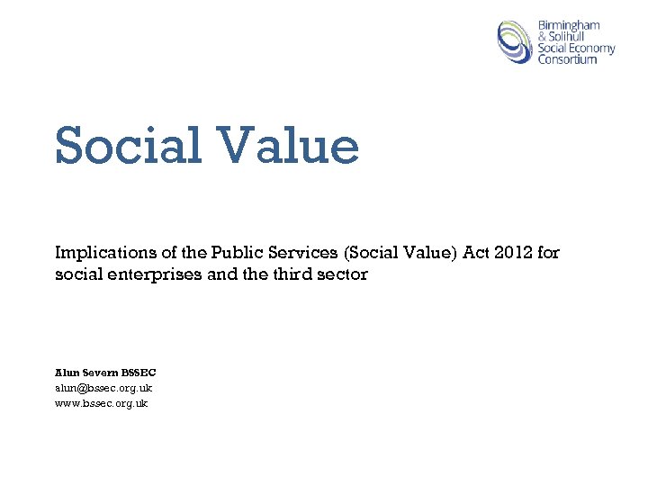 Social Value Implications of the Public Services (Social Value) Act 2012 for social enterprises and the third sector Alun Severn BSSEC alun@bssec. org. uk www. bssec. org. uk