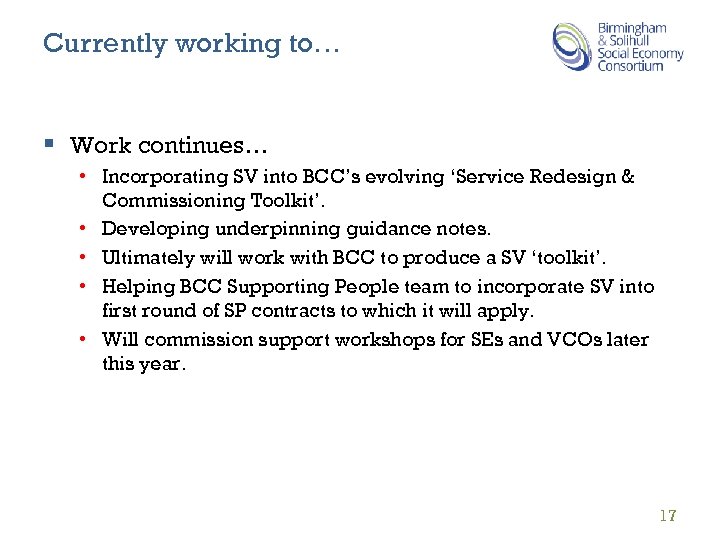 Documents & updates Documents and project updates including longer Briefing paper on SV: http: //bssec. org. uk/policy-issues/public-services-and-social-value/ BCC Social Value Policy and links to associated policies, Living wage and Business Charter for Social responsibility: http: //bssec. org. uk/birmingham-city-council-adopts-social-value-policy/ 18