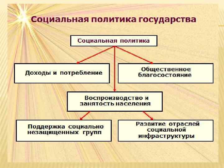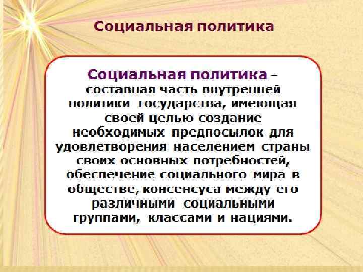 СОЦИАЛЬНАЯ ПОЛИТИКА В ШИРОКОМ ПОНИМАНИИ жилищная обеспеченность трудовые отношения миграционные процессы воспроизводство населения здравоохранение образование социальная поддержка распределение доходов