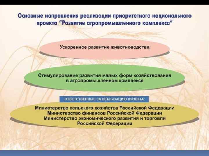 Национальный проект «Развитие АПК» Главные задачи: развитие животноводства, создание современного конкурентоспособного сельхозпроизводства, а также на стимулирование развития малых форм агробизнеса.