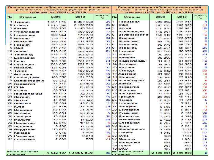 Статистика туризма в России Данные по выездному и въездному туризму в России в 2010 г. И их измерение в процентном выражении по сравнению с 2009 г.