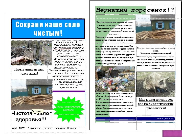 Ученики Создание раздаточного материала и организация волонтерских команд «Клещ! Вакцинация» Администрация «Известные люди поселения» , брошюра «День пожилого человека» , интерактивное мероприятие Активные жители «Детская площадка» , макеты, оформление Социальные партнеры Совет ветеранов, приглашение участников, сценарий, смета, проведение Центр социальной защиты населения, курсы для клиентов ДРСУ – придорожные аншлаги Лесхоз – высадка саженцев Родители «Спортивный выходной» , реклама, сценарий, участие