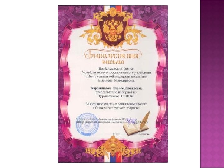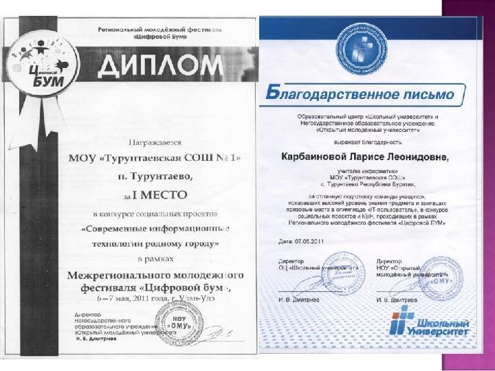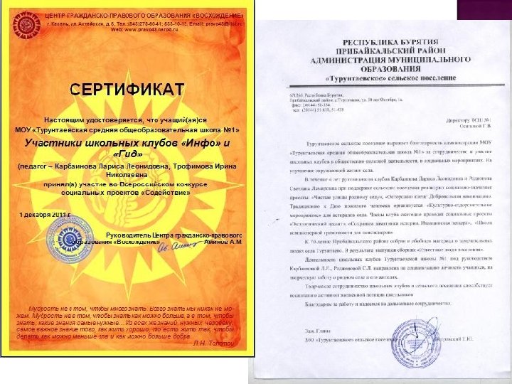 Уровень Название мероприятия (конкурс и т. п. ) Результаты региональный Конкурс социальных проектов в рамках регионального молодежного фестиваля «Цифровой БУМ» Тапхаева Александра, Пашинская Елена Диплом победителей, ценный приз всероссийский Всероссийский конкурс социальных проектов «Содействие» Сертификат участников клуба «Инфо» Воронин Иван, Скорняков Иван (8 «а» ), Седунова Надежда, Варфоломеева Кристина (9 «б» ). Проект «День пожилого человека» муниципальный Социальный заказ ПФРГУ «ЦСПН» Волонтеры «Университет третьего возраста» Благодарственное письмо. муниципальный Социальный заказ Турунтаевского сельского поселения. Проект «Известные люди поселения» . Положительный отзыв администрации сельского поселения. поселенческий Создание раздаточного материала и организация волонтерских команд «Клещ! Вакцинация» поселенческий Создание раздаточного материала и организация волонтерских команд «Бездомные животные»