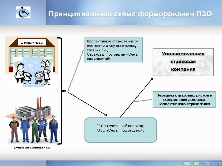Принципиальная схема формирования ПЗО Школы и сады Коллективное страхование от несчастного случая в пользу третьих лиц. Страховая программа «Семья под защитой» Уполномоченная страховая компания Передача страховых рисков и оформление договора коллективного страхования Уполномоченный оператор ООО «Семья под защитой» Трудовые коллективы