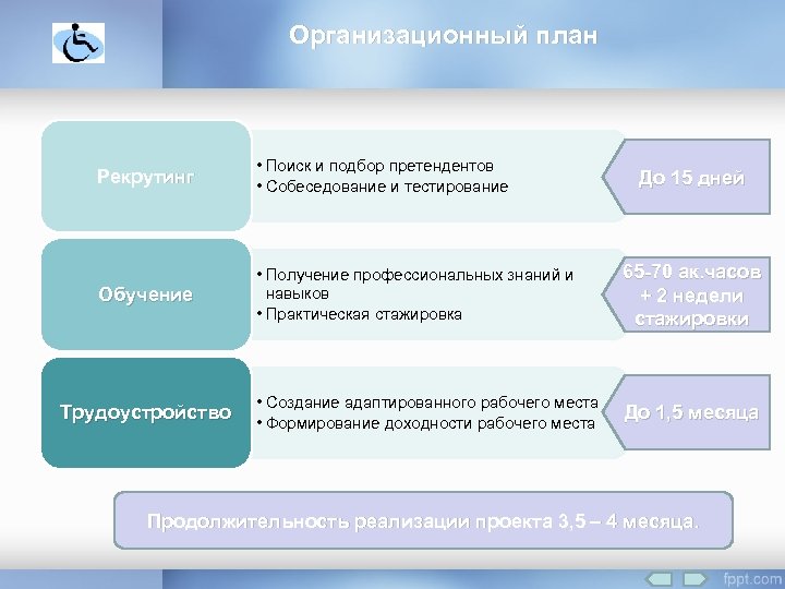 Организационный план Рекрутинг • Поиск и подбор претендентов • Собеседование и тестирование Обучение • Получение профессиональных знаний и навыков • Практическая стажировка 65 -70 ак. часов + 2 недели стажировки • Создание адаптированного рабочего места • Формирование доходности рабочего места До 1, 5 месяца Трудоустройство До 15 дней Продолжительность реализации проекта 3, 5 – 4 месяца.