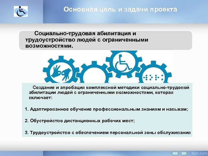 Основная цель и задачи проекта Социально-трудовая абилитация и трудоустройство людей с ограниченными возможностями. Создание и апробация комплексной методики социально-трудовой абилитации людей с ограниченными возможностями, которая включает: 1. Адаптированное обучение профессиональным знаниям и навыкам; 2. Обустройство дистанционных рабочих мест; 3. Трудоустройство с обеспечением персональной зоны обслуживания