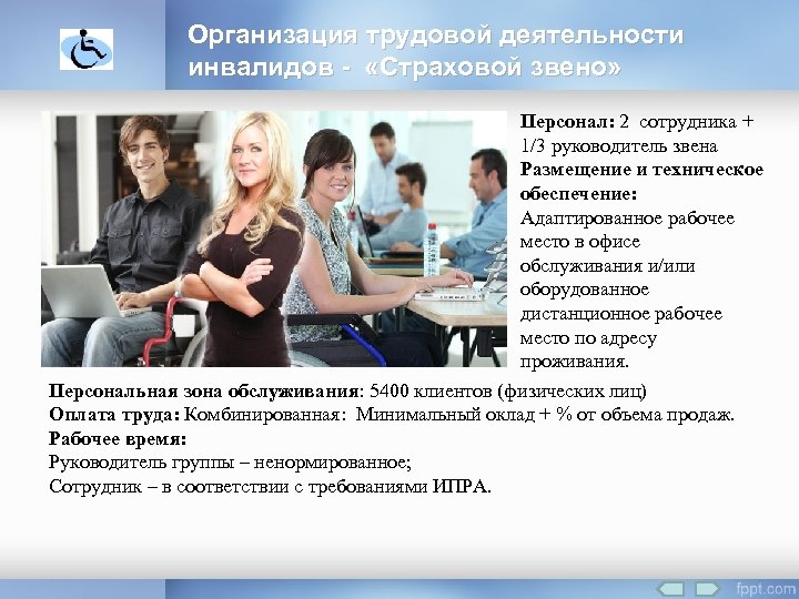 Организация трудовой деятельности инвалидов - «Страховой звено» Персонал: 2 сотрудника + 1/3 руководитель звена Размещение и техническое обеспечение: Адаптированное рабочее место в офисе обслуживания и/или оборудованное дистанционное рабочее место по адресу проживания. Персональная зона обслуживания: 5400 клиентов (физических лиц) Оплата труда: Комбинированная: Минимальный оклад + % от объема продаж. Рабочее время: Руководитель группы – ненормированное; Сотрудник – в соответствии с требованиями ИПРА.