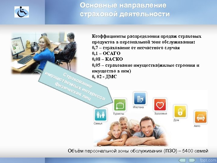 Основные направление страховой деятельности Коэффициенты распределения продаж страховых продуктов в персональной зоне обслуживания: 0, 7 – страхование от несчастного случая 0, 1 – ОСАГО 0, 08 – КАСКО 0, 05 – страхование имущества(жилые строения и имущество в нем) 0, 02 - ДМС им ущ Стр ест ахо фи венн вани е зич ых еск инт е их ли ресо ц в Объём персональной зоны обслуживания (ПЗО) – 5400 семей