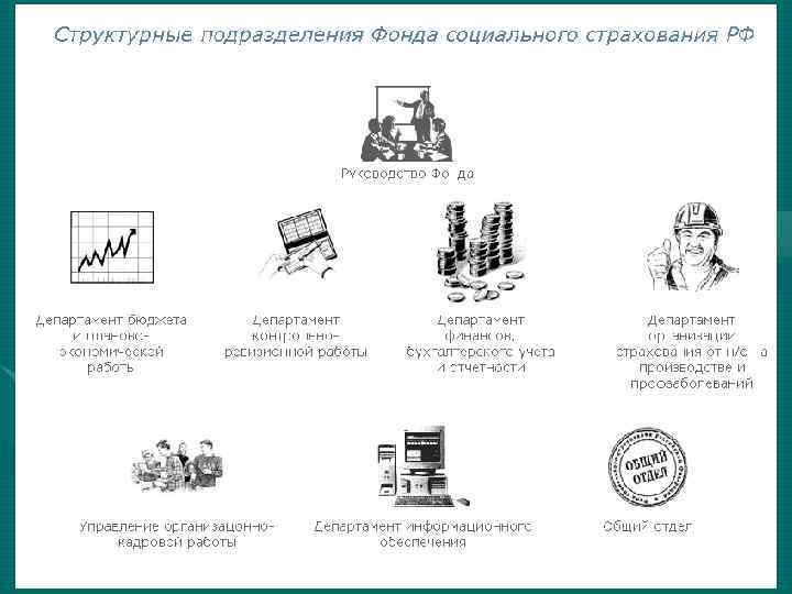 Законодательная основа ССГ • Управление системой обязательного социального страхования осуществляется Правительством Российской Федерации в соответствии с Конституцией Российской Федерации (пункт 1 статьи 13 федерального закона «Об основах обязательного социального страхования» от 16 июля 1999 г. 165 -ФЗ • Указ Президента РФ от 7 августа 1992 года 822 «О Фонде социального страхования Российской Федерации» ; • Указ Президента РФ от 28 сентября 1993 года 1503 «Об управлении государственным социальным страхованием в Российской Федерации» , • Постановление Правительства РФ от 26 октября 1993 года 1094 «Вопросы Фонда социального страхования Российской Федерации» ; • Положение о Фонде социального страхования Российской Федерации • Трудовой и гражданский кодексы РФ