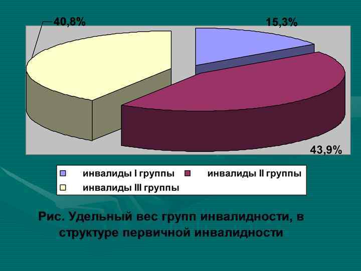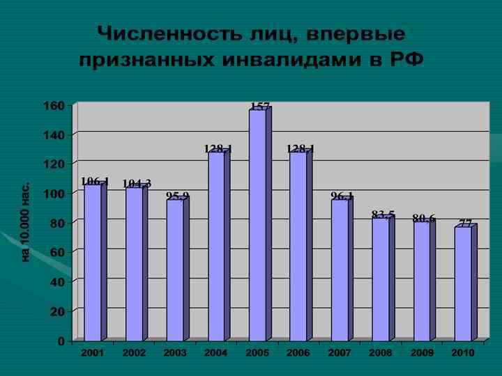 Численность лиц, впервые признанных инвалидами, в возрасте 18 лет и старше, по причинам инвалидности, на 10000 нас. , в РФ за 2009 г. Туберкулез (все формы) 2, 5 Болезни органов пищеварения 1, 5 Болезни системы кровообращения (1 место) 33, 3 Болезни органов дыхания 2, 1 Болезни глаза и его придаточного аппарата 2, 4 Болезни уха и сосцевидного отростка 0, 9 Болезни нервной системы 2, 7 Психические расстройства и расстройства поведения 3, 1 Болезни нервной системы (включая болезни глаза и придаточного аппарата, и болезни уха и сосцевидного отростка) (4 место) 6 Болезни костно-мышечной системы и соединительной ткани (3 место) 7, 1 Злокачественные образования (2 место) 15, 7 Профессиональные болезни 0, 2 Последствия травм (всех локализаций) (5 место) 4, 4