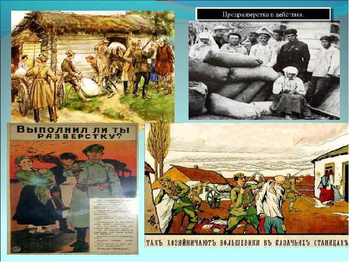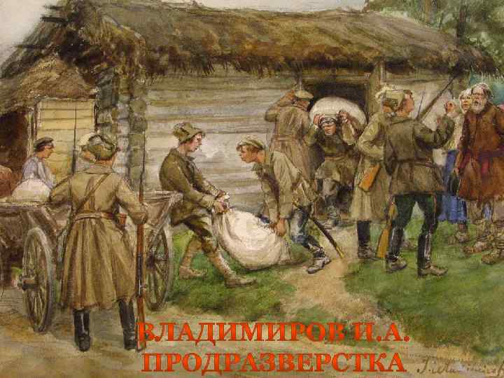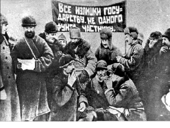 • Особенности военного коммунизма • Централизация управления экономикой, система ВСНХ ( Высший совет народного хозяйства), главков. • Национализация промышленности, банков и земли, ликвидация частной собственности. • Процесс национализации собственности в период гражданской войны носил название «экспроприация» . • Запрет наёмного труда и аренды земли • Продовольственная диктатура. Введение продразвёрстки (декрет СНК январь 1919 г)- продовольственной развёрстки. Это государственные мероприятия по выполнению планов сельхоззаготовок: обязательная сдача государству установленной ( «развёрстанной) нормы продуктов (хлеба и др. )по государственным ценам. Крестьяне могли оставить только минимум продукции для потребления и хозяйственных нужд.