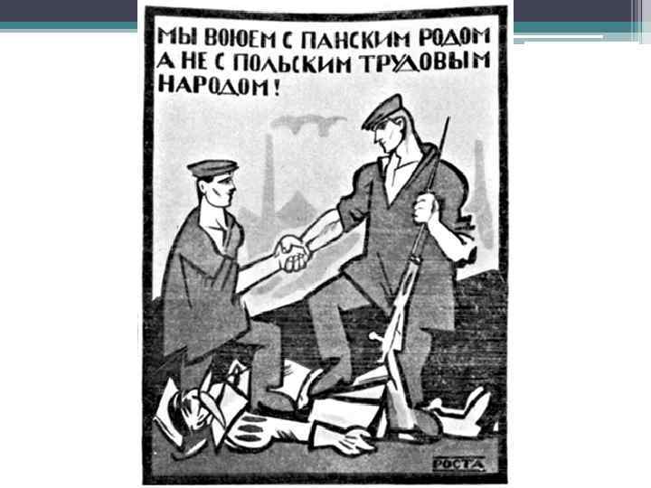 • • 11 июля 1920 г. Британский министр иностранных дел Дж. Керзон направил советскому правительству ноту с требованиями прекратить советское наступление на этой линии (по имени лорда Керзона линия и получила своё название), отвести советские войска на 50 километров к востоку от этой линии и заключить перемирие с Польшей. • • Однако советское правительство решило отвергнуть ноту и наступать на Польшу в целях её советизации, а в последствии и возбуждения революции в Германии и других странах Западной Европы. • 12 августа войска Западного фронта М. Тухачевского перешли в наступление, целью которого был захват Варшавы. Однако оно закончилось катастрофой. Советские войска в августе 1920 г. были наголову разбиты под Варшавой, и начали отступать назад. Многие советские армии были уничтожены, в плен попало более 120 тысяч красноармейцев. Это поражение Красной армии является наиболее катастрофичным в истории Гражданской войны • В октябре стороны заключили перемирие, а в марте 1921 г. в. Ригебыл подписан мирный договор. По его условиям к Польше отходила значительная часть земель на западе Украины и Белоруссии с 10 млн украинцев и белорусов (см. карту справа). • Итог советско-польской войны • • Ни одна из сторон в ходе войны не достигла поставленных целей: • • Белоруссия и Украина были разделены между Польшей и республиками, в 1922 году вошедшими в Советский Союз. • • Территория Литвы была поделена между Польшей и независимым Литовским государством. • • РСФСР со своей стороны признала независимость Польши и легитимность правительства Пилсудского, временно отказалась от планов «мировой революции» и ликвидации Версальской системы. Несмотря на подписание мирного договора, отношения между двумя странами оставались напряженными на протяжении последующих двадцати лет, что в конечном счёте привело к участию СССР в разделе Польши в 1939 году. •
