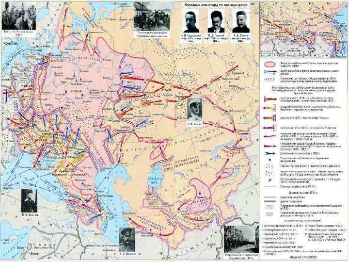 Завершение Гражданской войны • В 1920 году перед большевиками стояли две главные задачи: разгром Врангеля на юге и разрешение вопроса по установлению границ с Польшей. • Большевики признали независимость Польши, но польское правительство предъявило слишком большие территориальные требования. Спор не удалось решить дипломатическим путем, и Польша в мае захватила Белоруссию и Украину. Для сопротивления туда была направлена Красная Армия под командованием Тухачевского. Противостояние потерпело поражение, и советско-польская война завершилась Рижским миром в марте 1921 года, подписанным на более выгодных для противника условиях: Западная Белоруссия и Западная Украина отошли Польше. • Для уничтожения армии Врангеля был создан Южный фронт под главенством М. В. Фрунзе. В конце октября 1920 года Врангель потерпел поражение в Северной Таврии и был отброшен в Крым. После Красная Армия овладела Перекопом и захватила Крым. В ноябре 1920 года Гражданская война фактически завершилась победой большевиков.