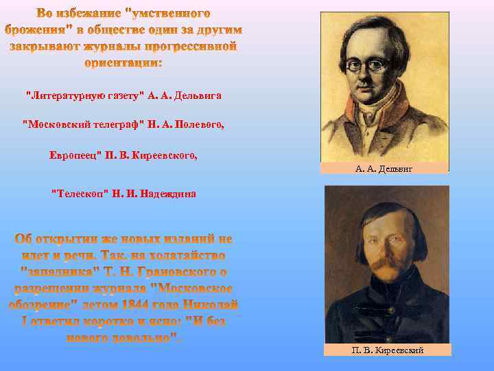 "Литературную газету" А. А. Дельвига "Московский телеграф" Н. А. Полевого, Европеец" П. В. Киреевского, А. А. Дельвиг "Телескоп" Н. И. Надеждина П. В. Киреевский