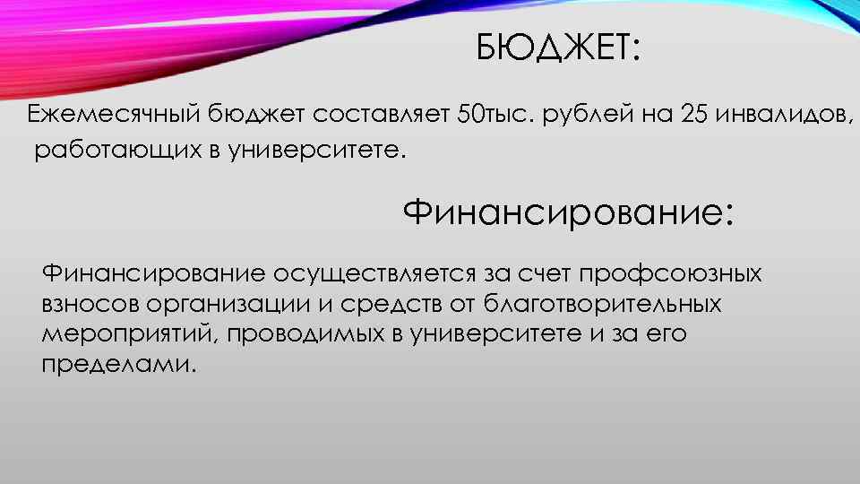 БЮДЖЕТ: Ежемесячный бюджет составляет 50 тыс. рублей на 25 инвалидов, работающих в университете. Финансирование: Финансирование осуществляется за счет профсоюзных взносов организации и средств от благотворительных мероприятий, проводимых в университете и за его пределами.