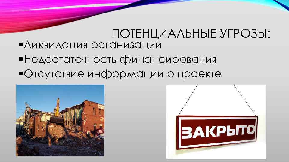 ПОТЕНЦИАЛЬНЫЕ УГРОЗЫ: § Ликвидация организации § Недостаточность финансирования § Отсутствие информации о проекте
