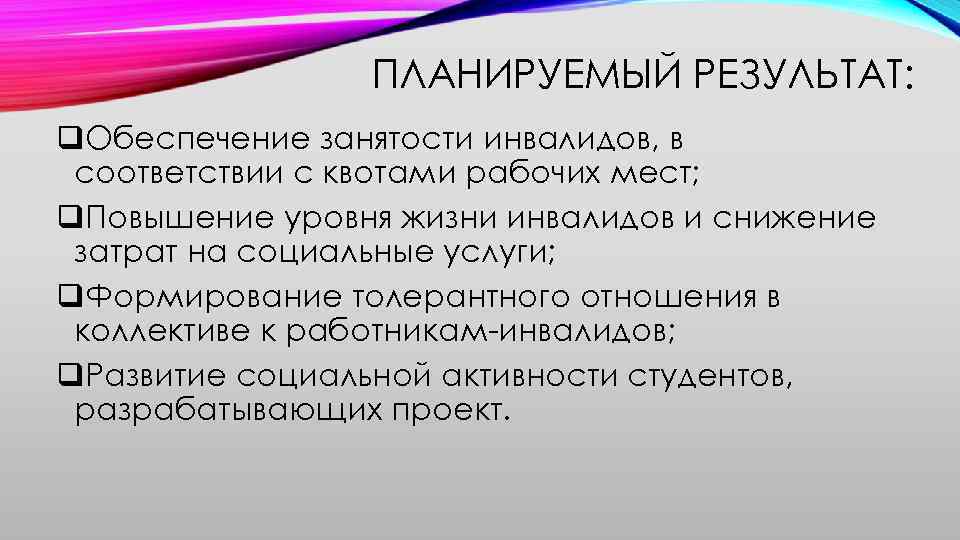 ПЛАНИРУЕМЫЙ РЕЗУЛЬТАТ: q. Обеспечение занятости инвалидов, в соответствии с квотами рабочих мест; q. Повышение уровня жизни инвалидов и снижение затрат на социальные услуги; q. Формирование толерантного отношения в коллективе к работникам-инвалидов; q. Развитие социальной активности студентов, разрабатывающих проект.