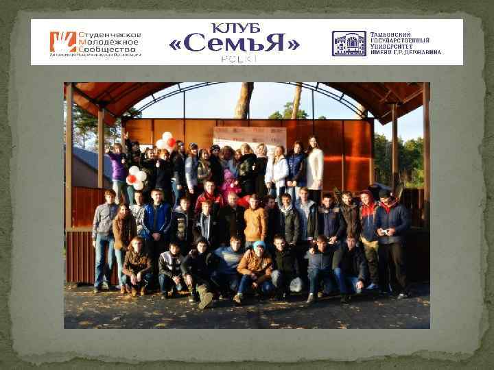 СПИКЕРЫ МАСТЕР-КЛАССОВ И Третий этап – события ОБРАЗОВАТЕЛЬНЫХ ПЛОЩАДОК: выходного дня (проведение Студенты-выпускники Детских домов, преподаватели, образовательных площадок волонтеры для социализации и поддержки в преодолении кризисной ситуации в молодых семьях Клуба «Семь. Я" на оздоровительной базе «Галдым» ФГБОУ ВПО «Тамбовский государственный университет имени Г. Р. Державина» ) РЕЗУЛЬТАТ: первое событие - приняли участие (18 человек) в Чемпионате по фрироупу на кубок ректора Мич. ГАУ 2014 г. (командное 1 и 2 место); второе событие: четырехдневный форум Клуб «Семь. Я» на студенческой оздоровительной базе отдыха «ГАЛДЫМ» (62 человека) 2014 г. ПОЕЗДКА участников Клуба в январе 2015 г. в Египет на «Международный форум социально-культурная анимация: от идеи к воплощению» при поддержке ТГУ имени Г. Р. Державина (34 человека).