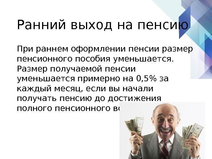 Ранний выход на пенсию При раннем оформлении пенсии размер пенсионного пособия уменьшается. Размер получаемой пенсии уменьшается примерно на 0, 5% за каждый месяц, если вы начали получать пенсию до достижения полного пенсионного возраста.