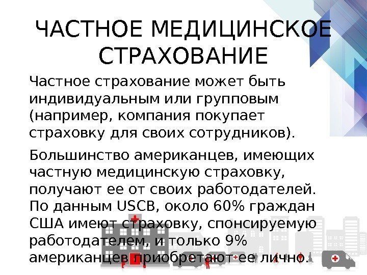 ЧАСТНОЕ МЕДИЦИНСКОЕ СТРАХОВАНИЕ Частное страхование может быть индивидуальным или групповым (например, компания покупает страховку для своих сотрудников). Большинство американцев, имеющих частную медицинскую страховку, получают ее от своих работодателей. По данным USCB, около 60% граждан США имеют страховку, спонсируемую работодателем, и только 9% американцев приобретают ее лично.