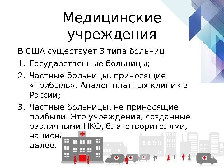 Медицинские учреждения В США существует 3 типа больниц: 1. Государственные больницы; 2. Частные больницы, приносящие «прибыль» . Аналог платных клиник в России; 3. Частные больницы, не приносящие прибыли. Это учреждения, созданные различными НКО, благотворителями, национальными меньшинствами и так далее.