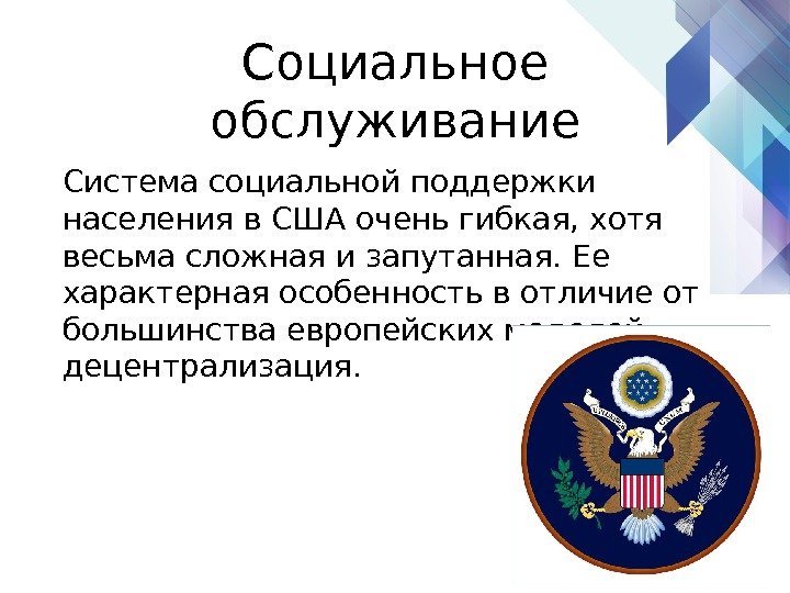 Социальное обслуживание Система социальной поддержки населения в США очень гибкая, хотя весьма сложная и запутанная. Ее характерная особенность в отличие от большинства европейских моделей децентрализация.