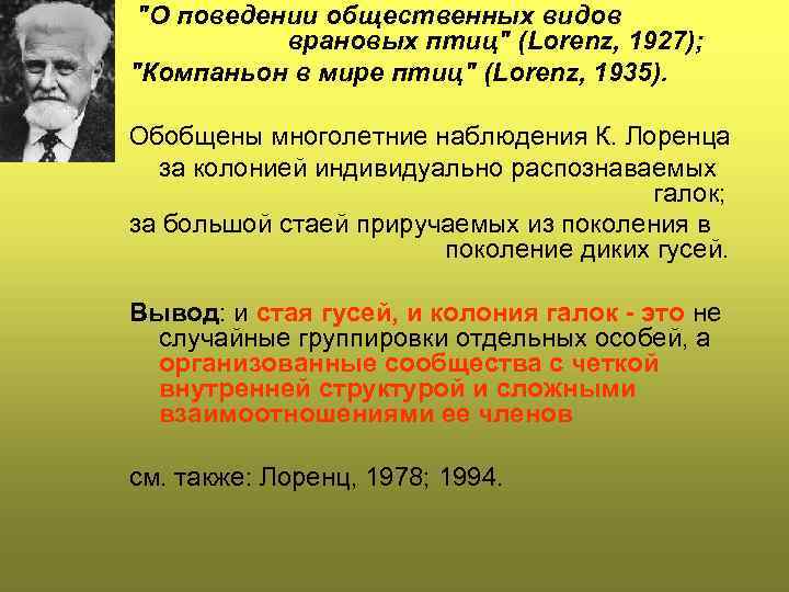 "О поведении общественных видов врановых птиц" (Lorenz, 1927); "Компаньон в мире птиц" (Lorenz, 1935). Обобщены многолетние наблюдения К. Лоренца за колонией индивидуально распознаваемых галок; за большой стаей приручаемых из поколения в поколение диких гусей. Вывод: и стая гусей, и колония галок - это не случайные группировки отдельных особей, а организованные сообщества с четкой внутренней структурой и сложными взаимоотношениями ее членов см. также: Лоренц, 1978; 1994.