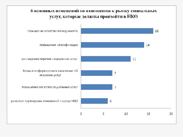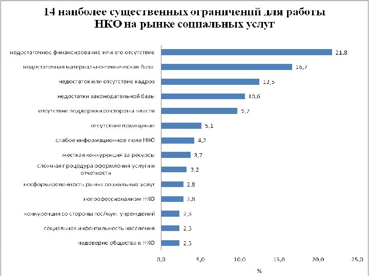 НКО и социальное предпринимательство o Оказание более полных и качественных социальных услуг, по сравнению с учреждениями и органами власти o Меньшее по сравнению с ними же количество социальных услуг, и их другой состав o Острый недостаток ресурсов o Недостаток квалифицированного менеджмента