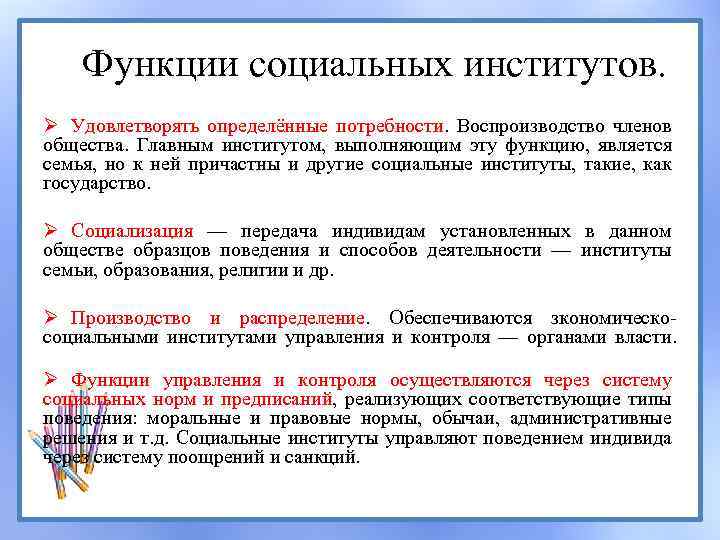 Функции социальных институтов. Ø Удовлетворять определённые потребности. Воспроизводство членов общества. Главным институтом, выполняющим эту функцию, является семья, но к ней причастны и другие социальные институты, такие, как государство. Ø Социализация — передача индивидам установленных в данном обществе образцов поведения и способов деятельности — институты семьи, образования, религии и др. Ø Производство и распределение. Обеспечиваются зкономическосоциальными институтами управления и контроля — органами власти. Ø Функции управления и контроля осуществляются через систему социальных норм и предписаний, реализующих соответствующие типы поведения: моральные и правовые нормы, обычаи, административные решения и т. д. Социальные институты управляют поведением индивида через систему поощрений и санкций.