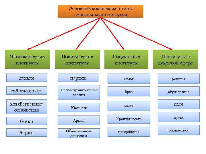 Основные комплексы и типы социальных институтов Экономические институты Политические институты деньги партии Социальные институты Институты в духовной сфере семья религия собственность Правоохранительные органы брак образование хозяйственные отношения Юстиция опека СМИ банки Армия Кровная месть музеи биржи Общественные движения материнство библиотеки