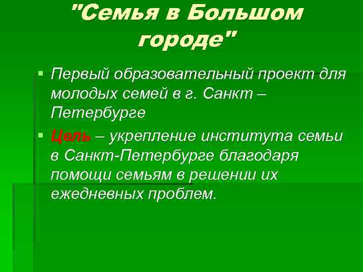 "Семья в Большом городе" § Первый образовательный проект для молодых семей в г. Санкт – Петербурге § Цель – укрепление института семьи в Санкт-Петербурге благодаря помощи семьям в решении их ежедневных проблем.