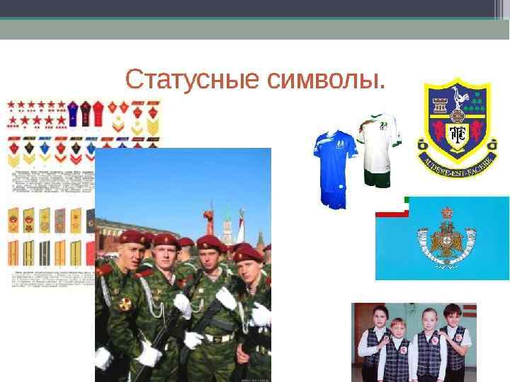 СТАТУСНЫЕ СИМВОЛЫ – это знаки отличия, позволяющие разграничить обладателей различных статусов. одежда жилье язык жесты Манеры поведения
