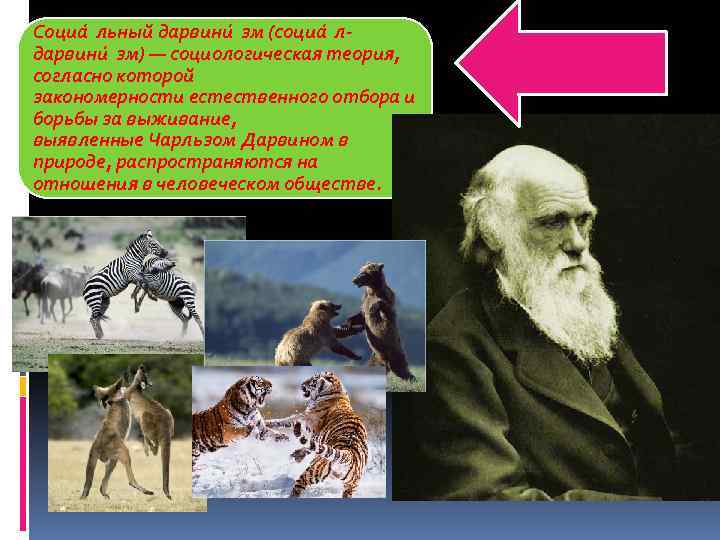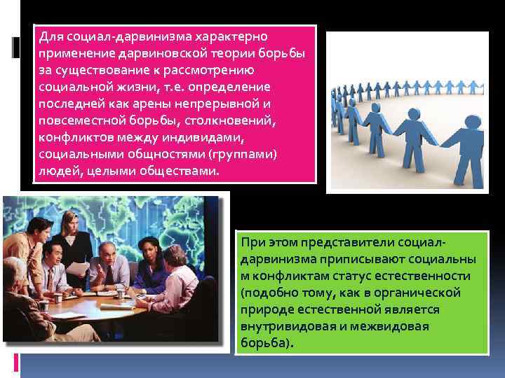 Для социал-дарвинизма характерно применение дарвиновской теории борьбы за существование к рассмотрению социальной жизни, т. е. определение последней как арены непрерывной и повсеместной борьбы, столкновений, конфликтов между индивидами, социальными общностями (группами) людей, целыми обществами. При этом представители социалдарвинизма приписывают социальны м конфликтам статус естественности (подобно тому, как в органической природе естественной является внутривидовая и межвидовая борьба).